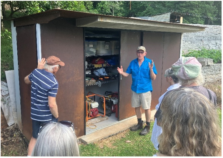 The ‘walk around’ workshop shared the Gormans’ ongoing process of hardening their property for climate change. The main focus was on bushfire resilience, discussing landscaping approaches and strategies to protect infrastructure such as sheds, water access and waste water systems